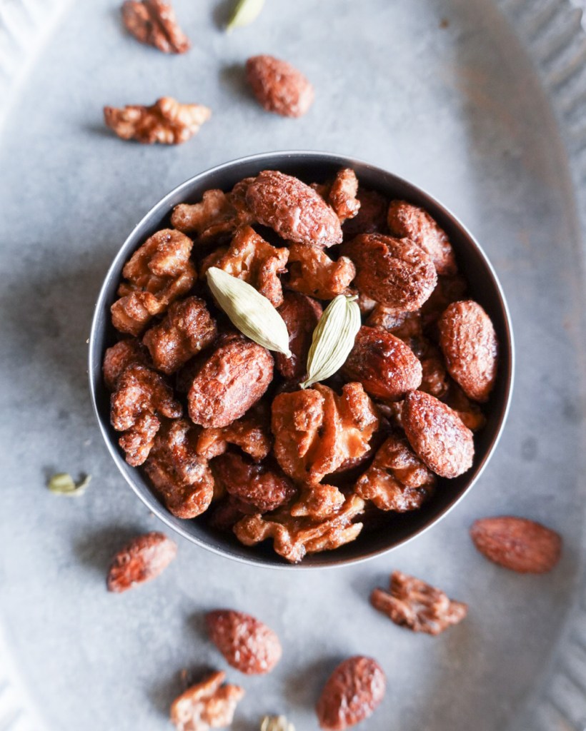 Enjoy these crunchy, sweet, and spiced nuts that make for a perfect snack or a lovely homemade gift! The extra step of baking in the oven after roasting with maple syrup ensures that they stay crunchy for days. The original version is with maple and spices like cinnamon and nutmeg, and the variation is with fresh rosemary.
