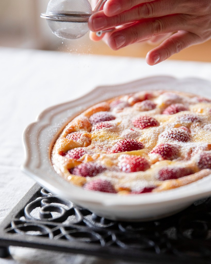 Strawberry clafoutis is a seasonal twist on the traditional French dessert, substituting the classic cherries with juicy strawberries. It combines ripe strawberries with a custard-like batter, resulting in a treat bursting with sweet and tangy flavors. Baked until puffed, the strawberries become tender and release their juices resulting in fresh-jam-like texture that pairs perfectly with egg batter. Enjoy as a decadent dessert or a delightful breakfast dish.