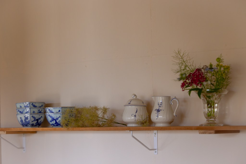 I visit my parents’ house in the countryside a few times a year, staying for about three nights each visit. That gives me roughly 15 days a year to enjoy the seasonal bounty in their garden and flower field. While it isn’t long, I make the most of it, savoring the greenery and flowers throughout the day. In the morning, I wake up, put on a hat, and take a walk around the field, cutting some flowers and greens. In the afternoon, when the sun is high, I venture out again, returning with a basketful of herbs to make fresh herbal tea. In the evening, I enjoy the silhouettes of dainty flowers on the wall, created by dim light.