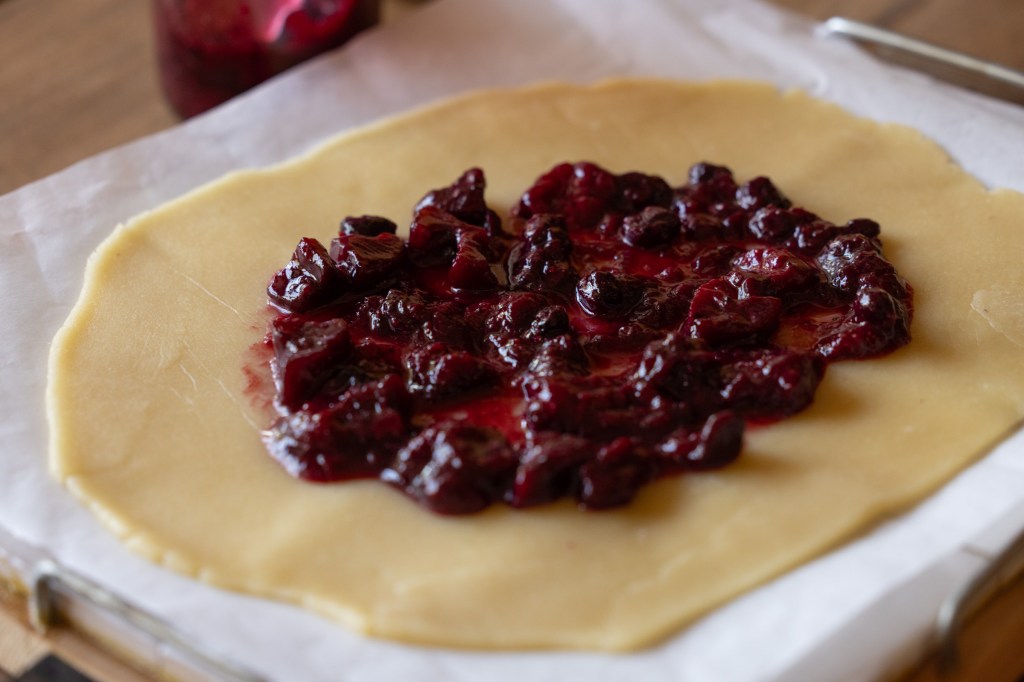 Typically, I use store-bought jam to cover the bottom of my galette, but this time, I had some leftover strawberries, blueberries, and kiwis that needed to be used. Rather than letting them go to waste, I decided to make a quick homemade jam. Using only 30% sugar by weight, the jam was lightly sweetened. Since I wasn’t aiming to preserve it long-term, the reduced sugar content was perfect.