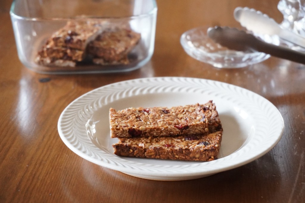 東京都世田谷区深沢のカフェ Kephi のメニュー監修をした際にリクエストのあったグラノーラバー。お店のチャイに合わせるお茶菓子として考えたメニューですが、朝ごはんにもぴったり。オートミール、デーツ、種色々、ドライフルーツも色々、と栄養満点です。